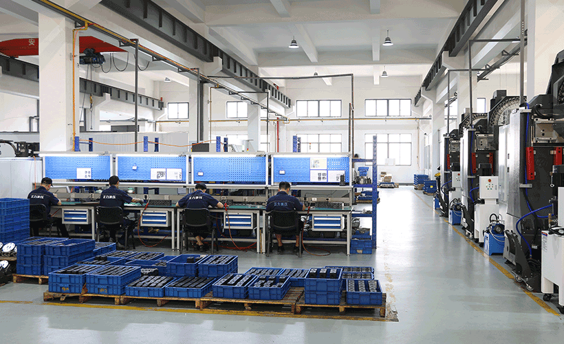 在液壓油缸測試壓力裝配平臺期間,采用液壓油管插入液壓筒油...